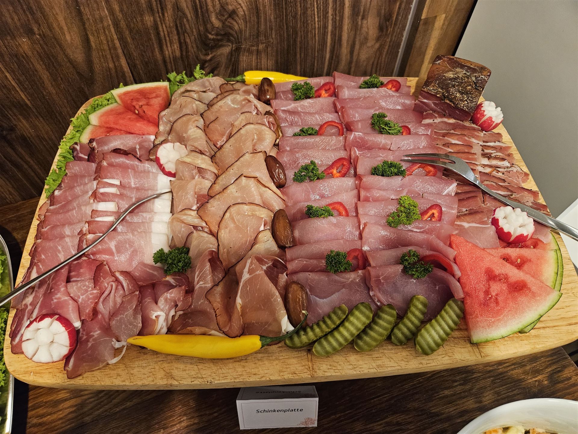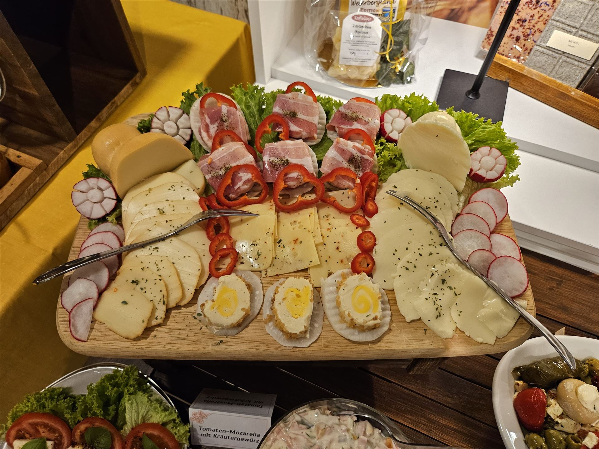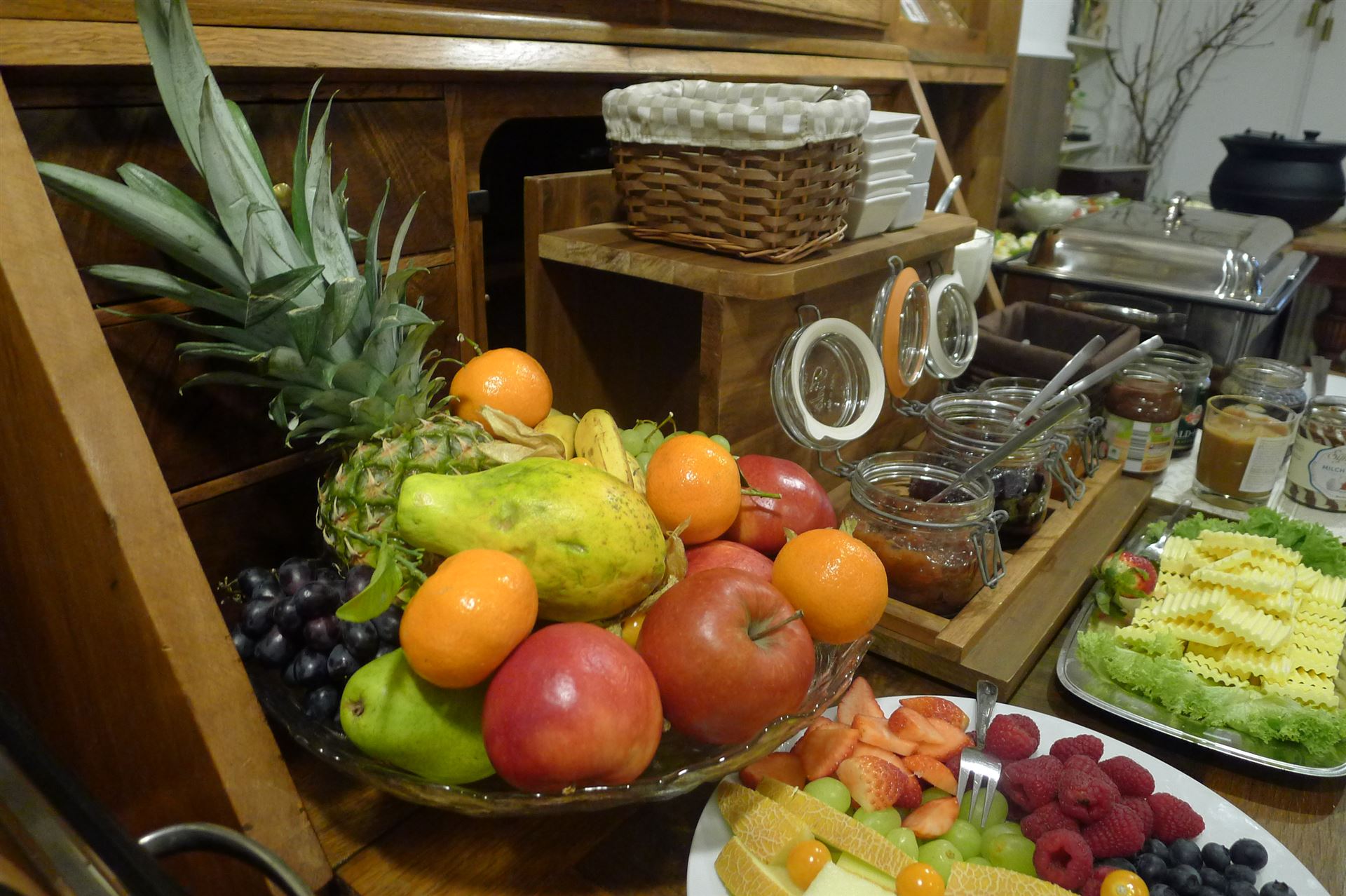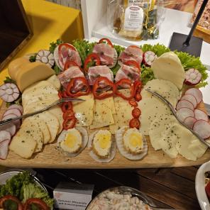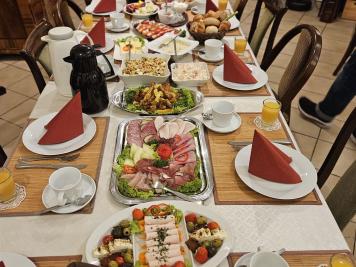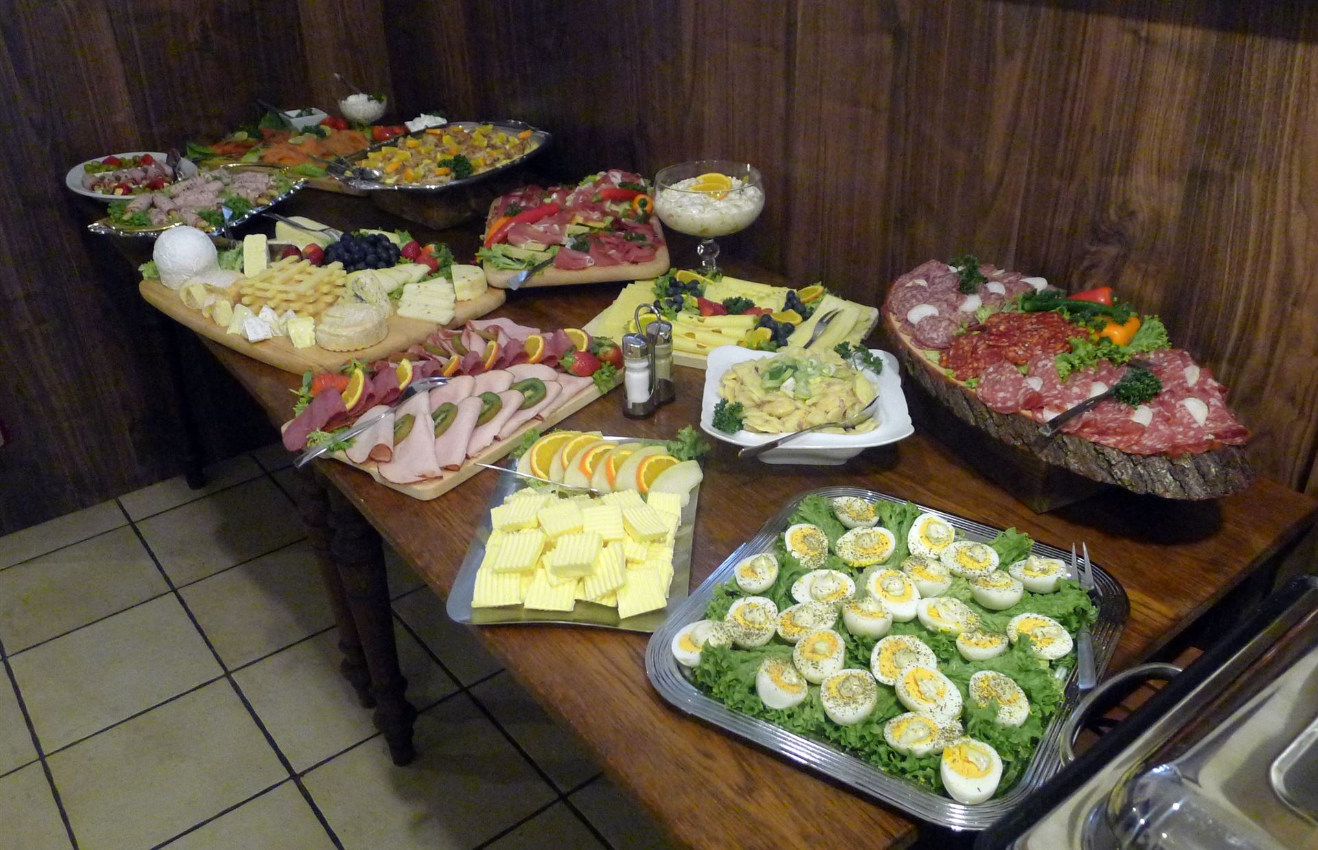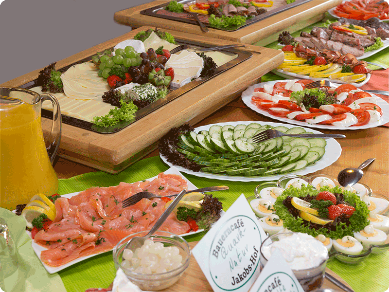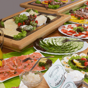 Einmal im Monat bieten wir ein reichhaltiges Sonntagsfrühstück in Buffetform an. Dies beinhaltet hausgerösteten Kaffee satt, Tee, ein Glas Orangensaft, Butter, hausgemachte Marmelade, Honig, Früchte mit Joghurt, diverse Wurstwaren (Schinken, Mettwurst), verschiedene Käsesorten, Rührei, gekochte Eier, Lachs, Antipasti, unterschiedliche Salate, Tomaten mit Mozzarella sowie weitere hausgemachte Köstlichkeiten.