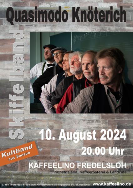 Quasimodo Knöterich, die Kultskiffleband aus Seesen, bringt vornehmlich Ohrwürmer aus Irland und Schottland zu Gehör – die Palette reicht von Trink- und Raufliedern bis hin zu Hommagen an traumhafte Landschaften. Aber auch Skiffleklassiker aus den USA stehen auf der Setlist der sechs Muntermacher. Das i-Tüpfelchen sind schließlich deutschsprachige Songs, die das Repertoire der „Wald- und Wiesenband“ abrunden. Wir freuen uns auf das Event…, denn bei Quasimodo ist immer Stimmung angesagt.