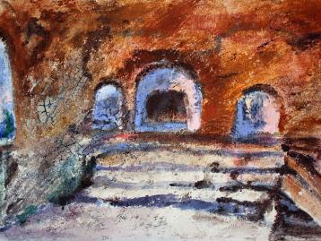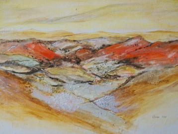 Erde hat, je nach Zusammensetzung und dem Herkunftsland, nach dem Gehalt an Mineralien, Oxiden und Pigmenten ganz unterschiedliche Farben und Strukturen. Erde kann, entsprechend aufbereitet, auf die Leinwand aufgetragen werden. Die entstehenden Bilder sind oft pastos, teilweise sind Fremdartikel des Herkunftsbodens zu erkennen. Das Material verleitet zu Motiven aus der Natur. Erdige Assoziationen drängen sich auf. Die farbigen Erden können problemlos mit Farben wie Öl, Acryl, Tusche und Aquarell zusammen verarbeitet werden. Die Künstlerinnen Christa Paetsch-Mönkeberg und Susanne Rombach arbeiten beide mit dem gleichen Material, spannend ist die Bandbreite an Duktus und Interpretation. Von beiden Künstlerinnen sind als Ergänzung der Ausstellung Malerei und Zeichnungen in Aquarell, Acryl, Öl und Tusche zu sehen.